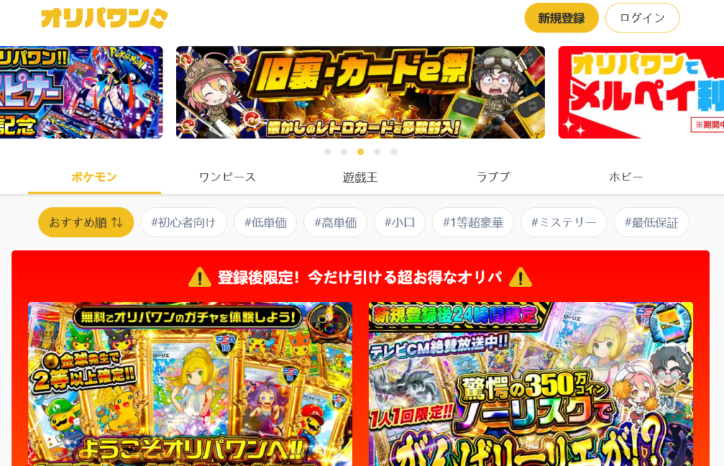 オリパワンは「とにかく当たりを狙いたい」「開封のワクワクを楽しみたい」という人に最適なサービスです。還元率の高さと豪華ラインナップにより、他サービスと比較しても“勝ちやすい設計”がされている点が魅力。特に人気タイトルに強く、初心者でも始めやすい設計になっているため、迷ったらまず選んで間違いない王道サービスです。