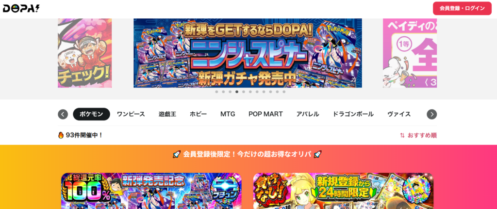 DOPAオリパは、SNSでも話題のオンラインオリパサービスで、特に「高還元イベント」と「当たり報告の多さ」が特徴です。期間限定の激アツガチャが頻繁に開催されており、短期間で大きく勝てるチャンスがあるのが魅力です。