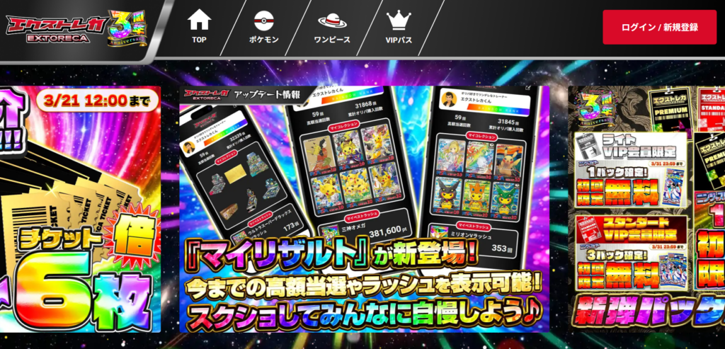 エクストレカは、高還元オリパと豪華ラインナップで人気を集めているオンラインオリパサービスです。ポケモンカードやワンピースカードを中心に、PSA10や高額カードが狙えるガチャが豊富に用意されており、「一撃の爆アド」を狙いたいユーザーから高い支持を得ています。