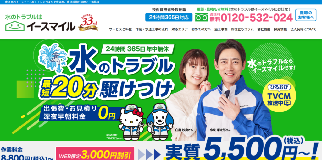 イースマイルは、テレビCMでも知られる知名度の高い水道修理サービスで、全国対応と安定したサービス品質が特徴です。24時間365日対応しており、急なトラブルにも迅速に駆けつけてくれます。