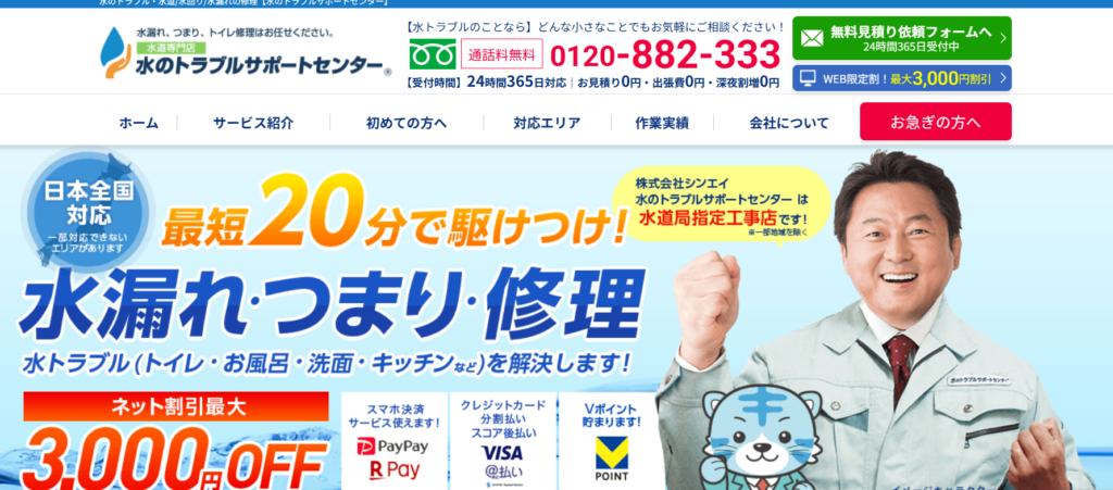 水のトラブルサポートセンターは、スピード対応と柔軟なサービス内容が特徴の水道修理業者です。24時間対応で、深夜や早朝のトラブルにも迅速に対応してくれます。